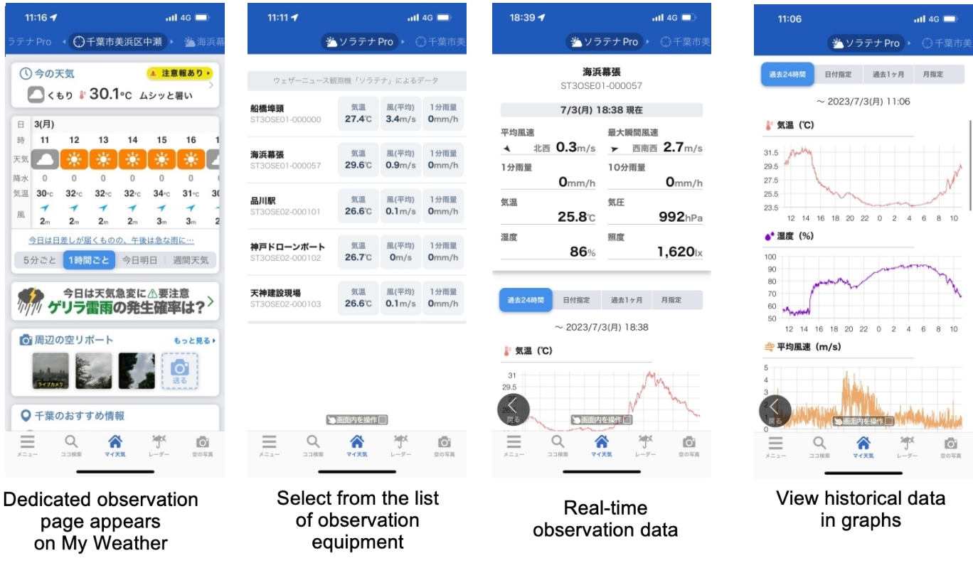 On the dedicated page, seven types of observation data can be viewed in real time and past data can be checked in graphs. Furthermore, push notifications will be sent out when the observed value exceeds the threshold value. Users can select two elements from air temperature, rainfall amount, and wind velocity, and set the thresholds and titles. By predetermining actions to be taken in response to notifications, companies can respond quickly to heavy rain, strong winds, and high/low air temperatures.