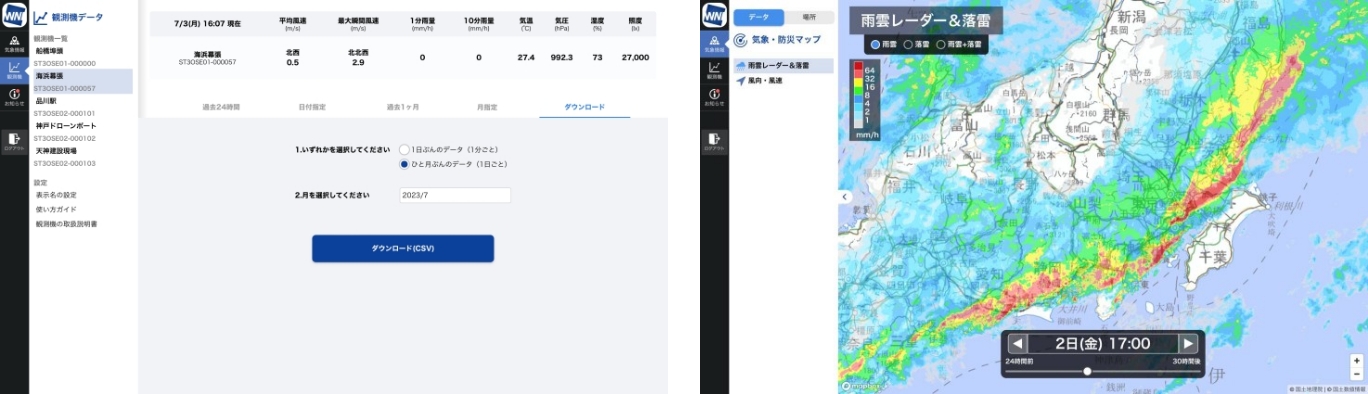 PC version: (Left) Observation data download screen (Right) Raincloud radar