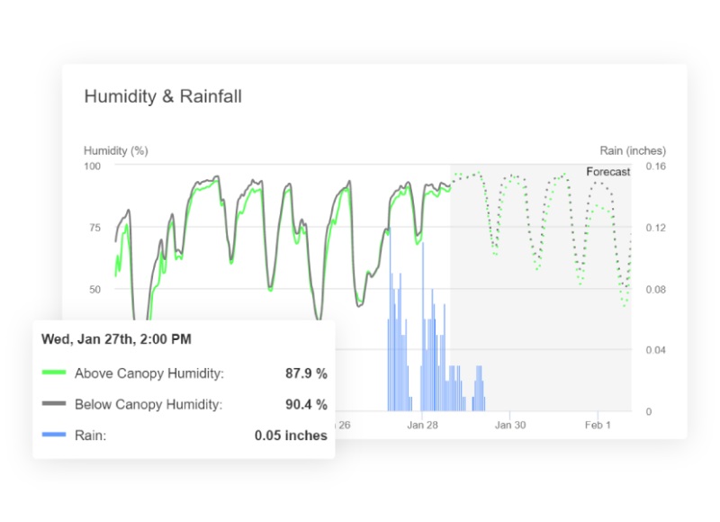 Plan ahead: See 7-day forecasts of key climate conditions including temperature, above and below canopy humidity, wind speed, and more.